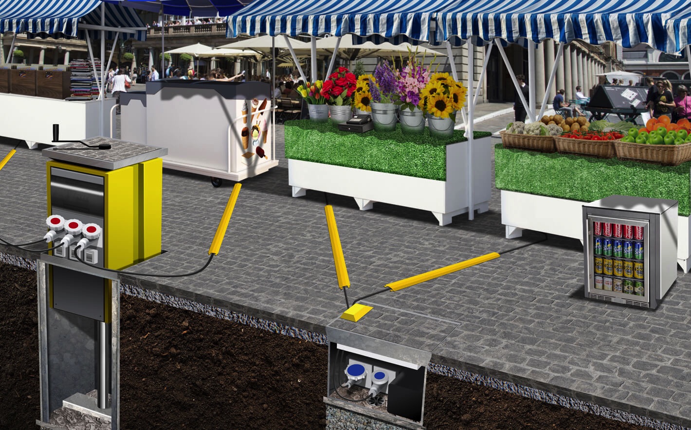 Equipping any outdoor space with a power infrastructure is going to add a great degree of flexibility of use to the location. But when designing the power supply, it is important to have a picture of the typical and maximum usage that will be required. Going back to basics, why is the site going to benefit from a power infrastructure? For a business such as a restaurant, bar, café or hotel, the outdoor space could add additional areas for eating and drinking primarily. Such uses would typically require the power distribution to provide access to sockets for lighting, till points, AV equipment or outdoor serving points such as mobile counters or drinks dispensers. But is that the limit to such a site’s potential? Could it also be used as a stage are for outdoor music performances and other entertainment, for example. And if so, would your proposed power supply solution accommodate these requirements too? Also think about the location of the power units in relation to how they will be used. If the site is to be used for market stalls, where will the stalls be set up on site and where will the main pedestrian routes be? Installing power units in the correct locations will help reduce the risk of trip hazards as cables trailing across the main footfall areas can be minimised or avoided completely.
