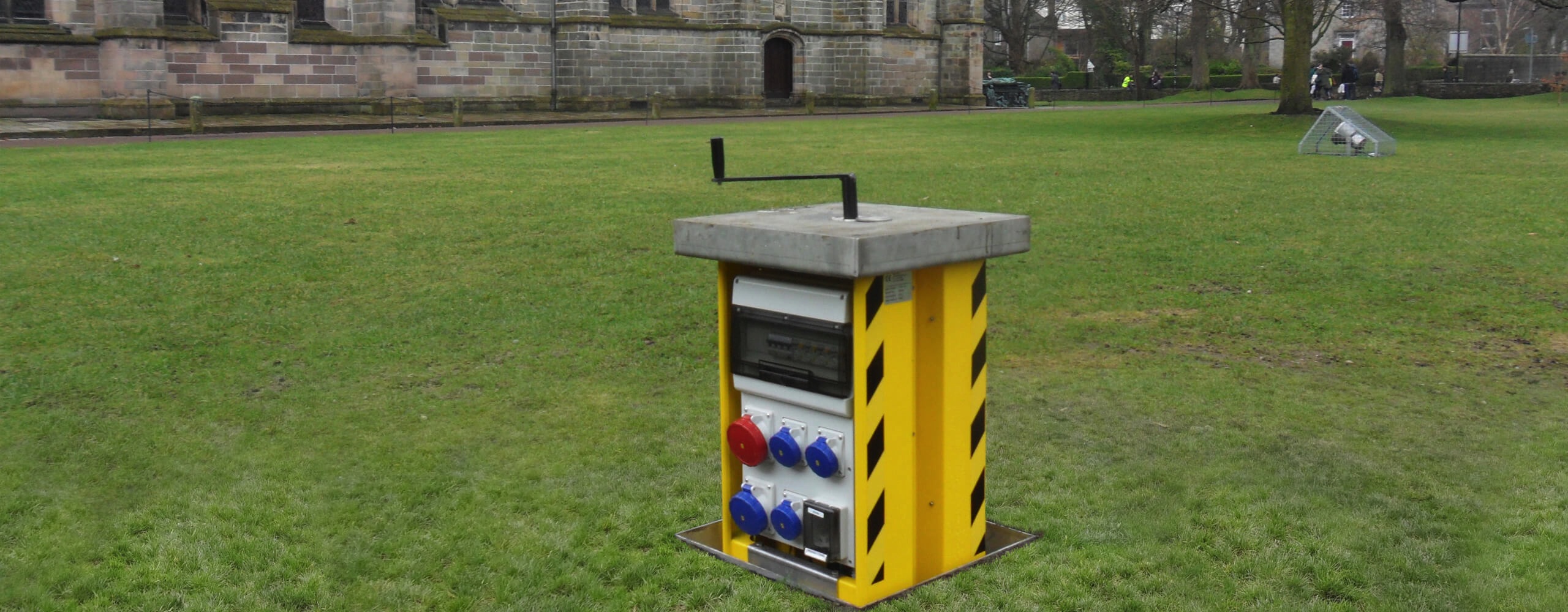 The units were required for the outside lawn areas by The Kings College Chapel and Elphinstone Hall to provide outdoor power to marquees used for weddings, corporate and sports events. They are buried out of sight and raised by a turning handle. The cover of each unit is recessed to match the surface surrounding the power supply - in this instance turf.